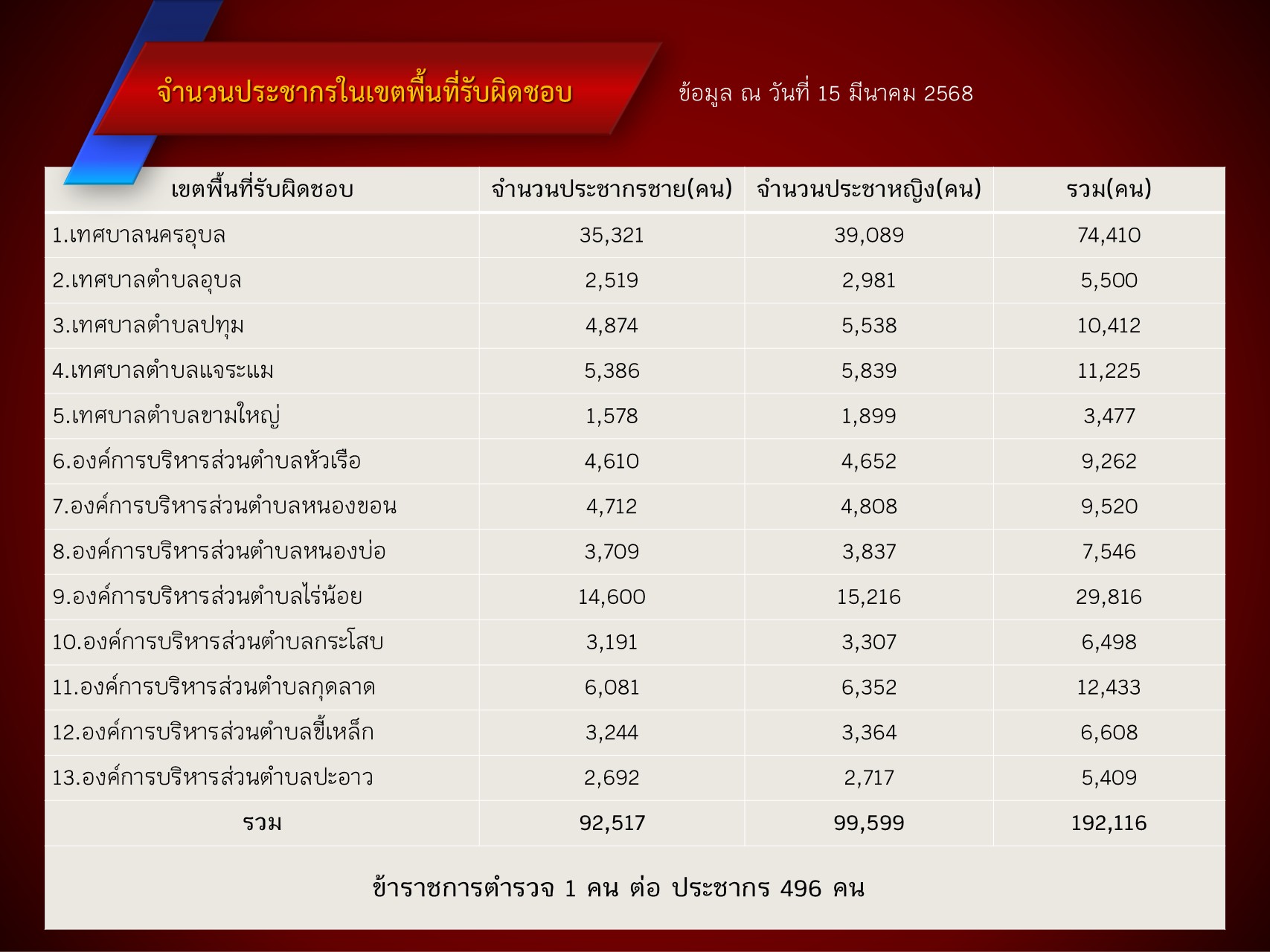 จำนวนประชากรแยกตามเขตพื้นที่